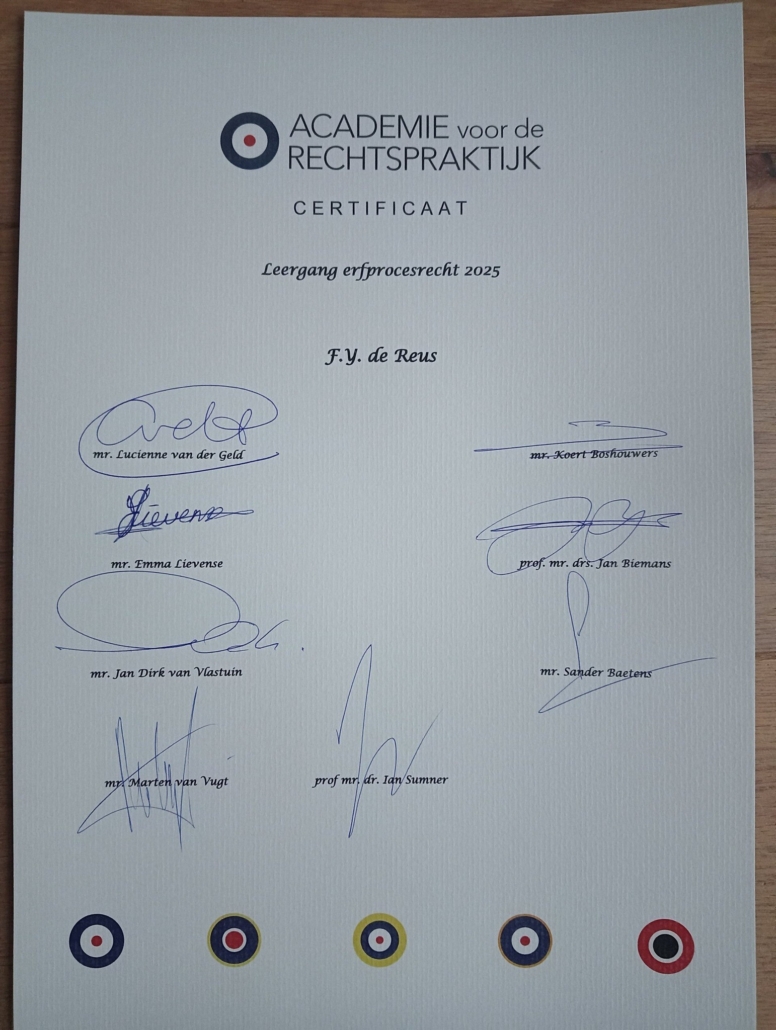 Nadat de advocaat van Reus Advocatuur met goed gevolg het examen van de VEAN (Vereniging Erfrecht Advocaten Nederland) heeft afgelegd, heeft zij vervolgens eind 2025 ook de leergang Erfprocesrecht afgerond.